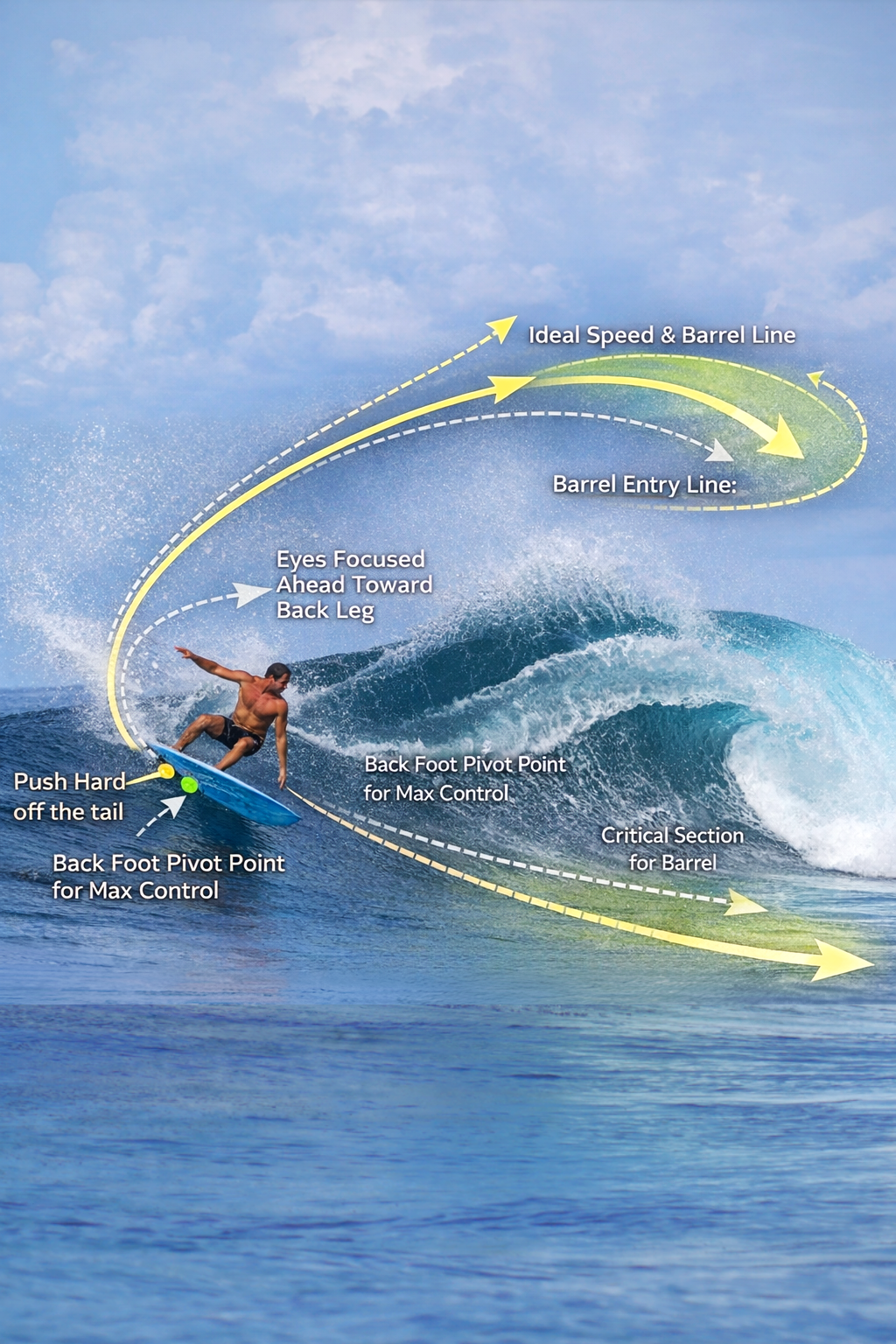 This service is designed for intermediate to advanced surfers who want to improve performance surfing with a strong focus on barrel riding (takeoff timing, positioning, line choice, speed control, stall, and exits).